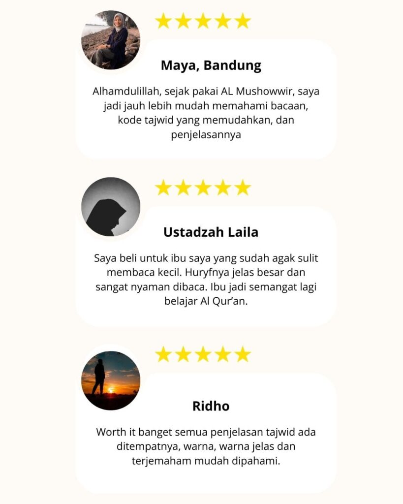 Al-Qur’an AL-MUSHOWWIR dengan terjemahan per kata, transliterasi latin, dan kode tajwid berwarna. Sempurna untuk pemula, orang tua, dan siapa saja yang ingin memperbaiki bacaan tanpa guru.